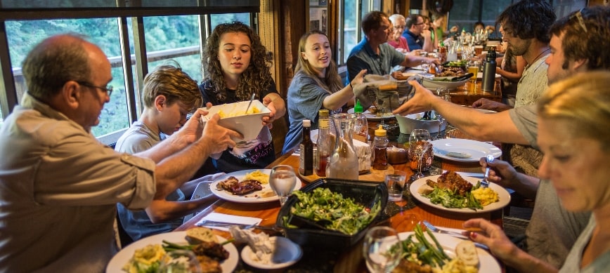 Dinner is a hearty, home-cooked feast—sometimes just for our group, sometimes alongside fellow river travelers. After dinner, relax by the fire or stroll under the star-filled sky.